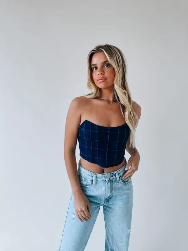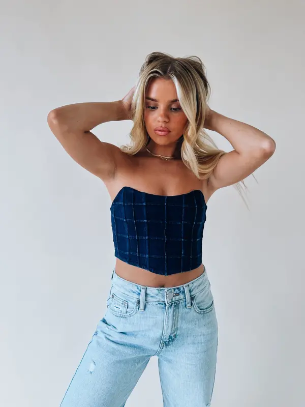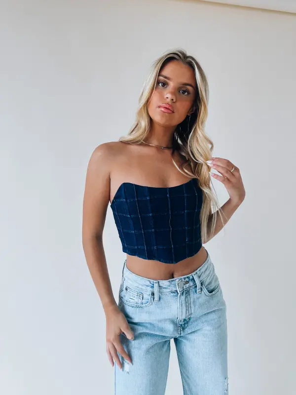 Our Carrie Denim Bustier Top has a checkered board pattern. This strapless top a no slip grip on the inside to help it from slipping down. There is some boning detail stitched into the front of this item to give it that “bustier” look. There is a back zipper closure with a hook and eye clasp. This item would be absolutely perfect for any concert or country festival! It is definitely a MUST HAVE for your closet!
