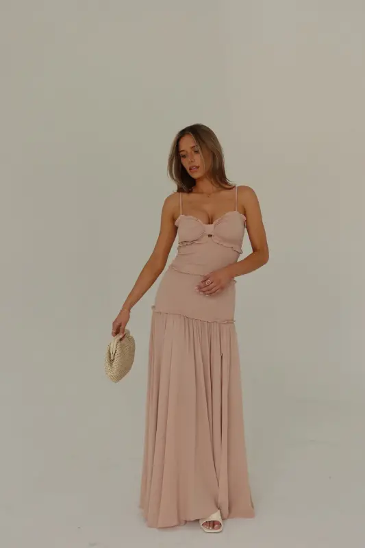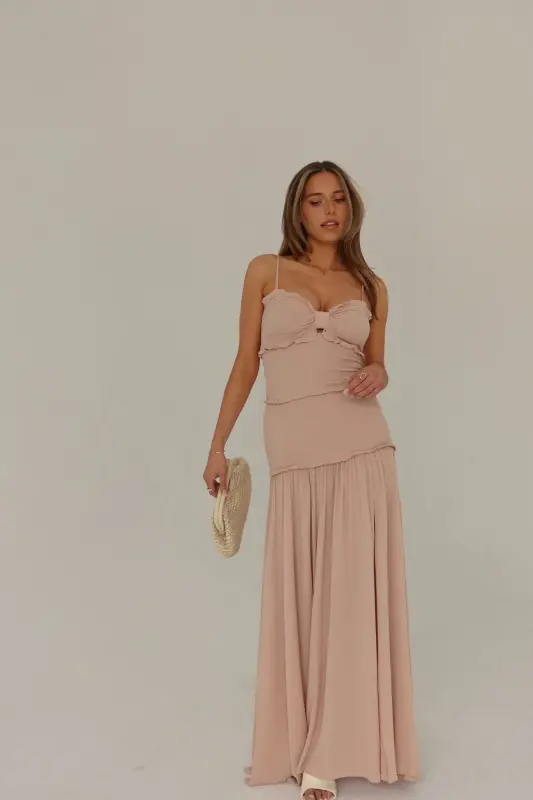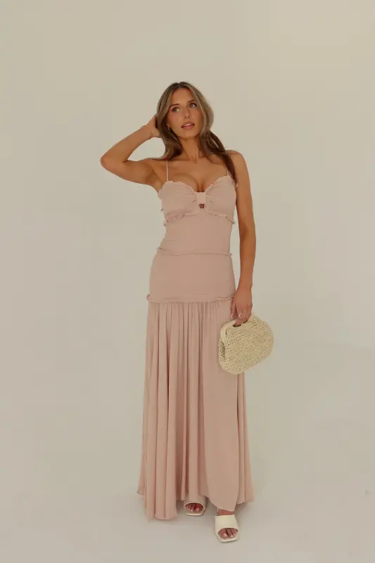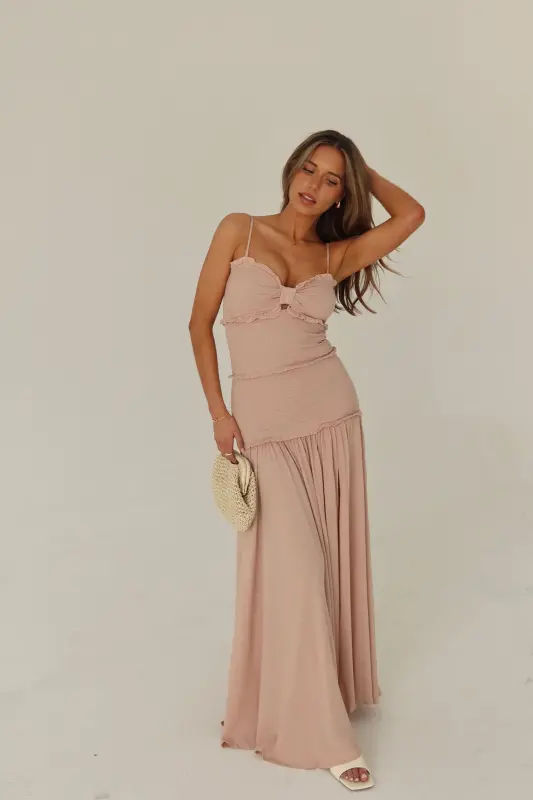 Introducing our enchanting Gabriella Smocked Maxi Dress, a captivating ensemble that combines sophistication with allure. With its side front leg slit adding a touch of elegance, this dress boasts a cut-out bust adorned with a charming keyhole detail, complemented by delicate ruffle accents and removable adjustable spaghetti straps. The smocked bodice ensures a flattering fit, flowing seamlessly into a maxi linen skirt below the knees, complete with another side leg slit for added allure. Offering stretch and a true-to-size fit, this dress promises both comfort and style, making it a must-have for any special occasion.