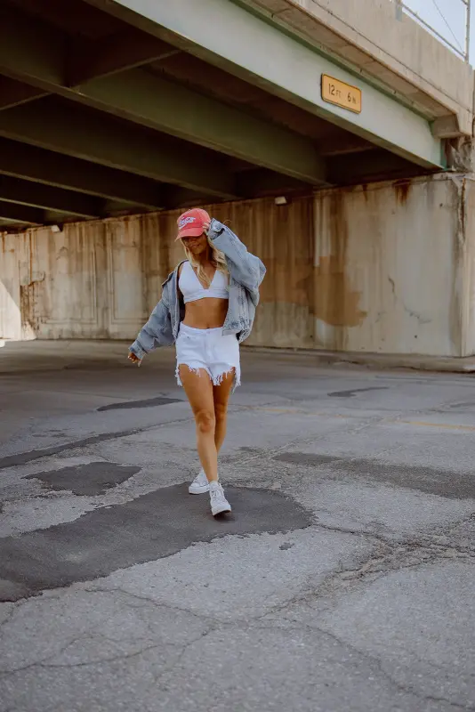 Our Nova Denim Shorts Set is a the denim two piece that is completed with denim bra top and high waisted denim shorts. This denim bra top features triangle neckline, adjustable straps, and and adjustable back closure for a customizable fit. The bottoms of this set have high rise waistline, relaxed fit, and distressed asymmetrical hemline with longer length in the back for added coverage. These bottoms are completed with a button and zipper closure. This all white denim set is made of true denim with very little stretch so if in between sizes we recommend sizing up.