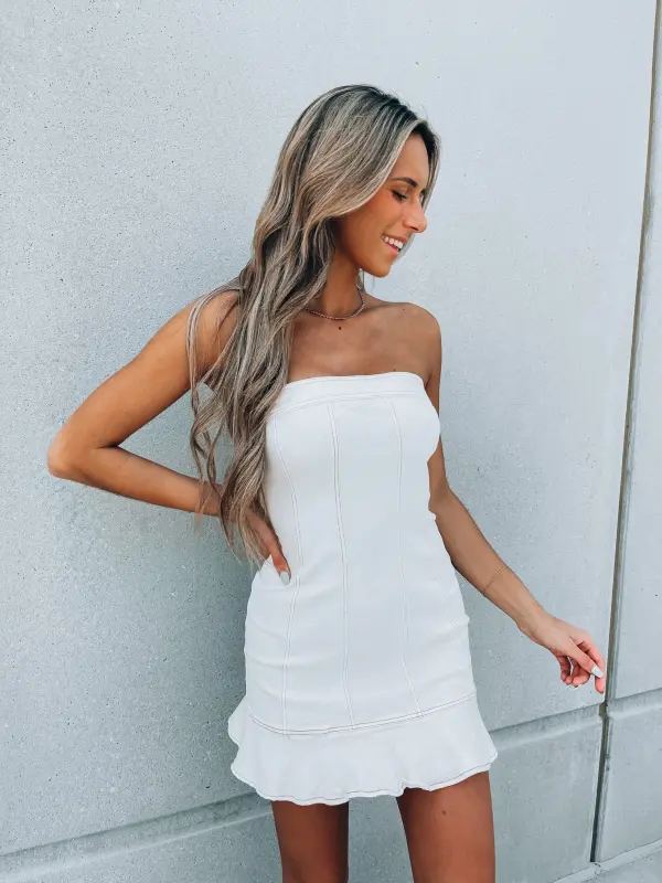 Our Richelle Denim Strapless Mini Dress has a cute ruffle bottom. There is stitching detail throughout the dress. There is a back zipper closure with a hook and eye clasp. This would be the perfect date night dress!
