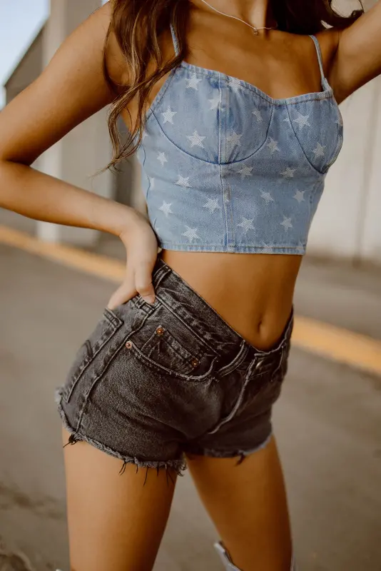 Our Star Denim Bustier Top is a cropped denim bustier. This denim bustier top features a sweetheart neckline, adjustable straps, pronounced bust line, and cropped fit. This denim crop top is completed patriotic star design throughout, smocked back detail ,and exposed zipper closure. This top is true to size and has stretch throughout.